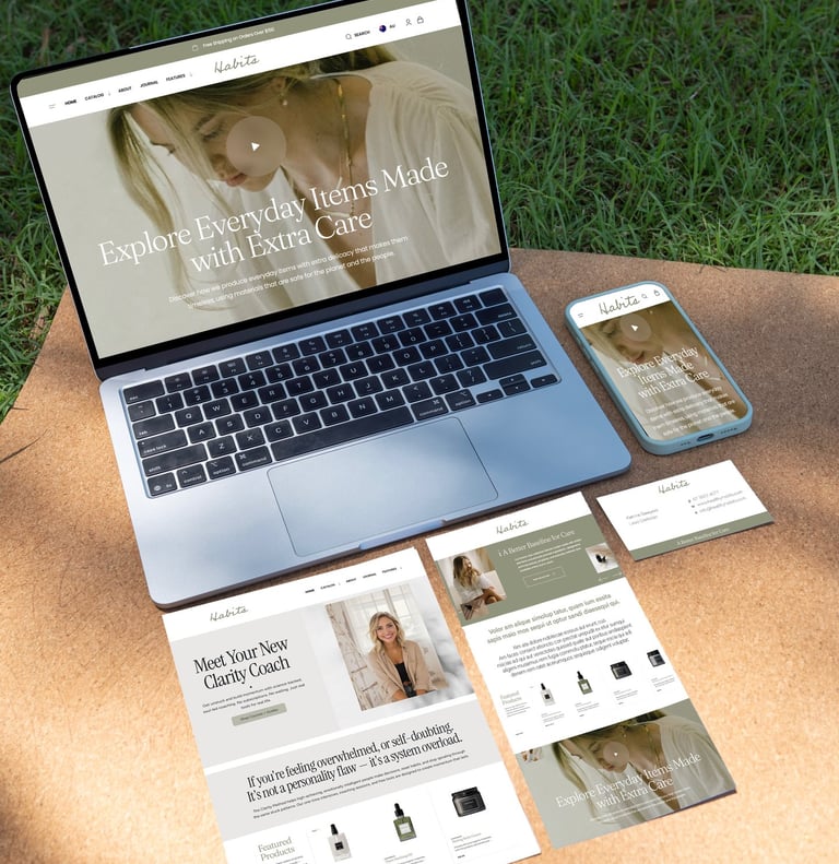 The Business Starter Package is a fully cohesive brand ecosystem: strong visual foundations paired with an online store that is beautifully designed, functional, and built to convert. Everything works together — online and offline — to create a confident, consistent brand experience.